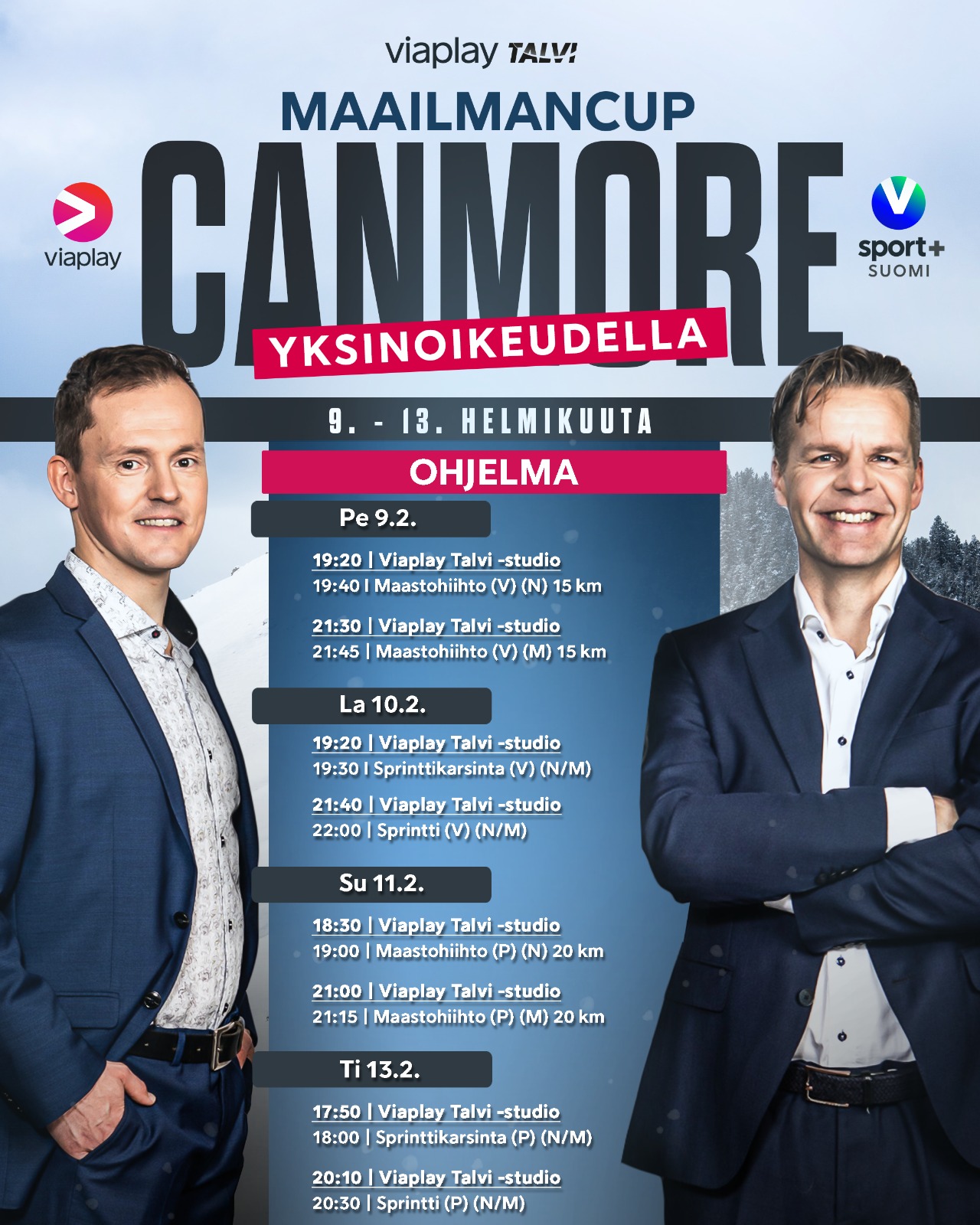 Hiihdon maailmancupin kiertue siirtyy Pohjois-Amerikkaan. Kanadan Canmoressa hiihdetään peräti neljänä kisapäivänä, ja Yhdysvaltain Minneapolisissa kahtena kisapäivänä. Rupeaman avauskisa on perjantaina 9. helmikuuta kilpailtava 15 kilometrin (v) yhteislähtö. Canmoren ja Minneapolisin kisat ovat katsottavissa yksinoikeudella Viaplayssa ja V sport –kanavilla, ja mikä parasta, herkulliseen ilta-aikaan.